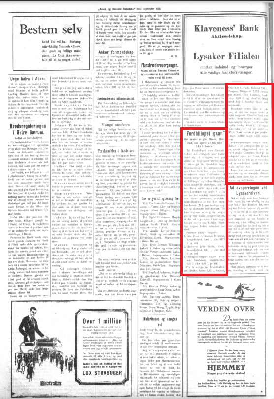 Vv 4: Fordbilløp. For 100 år siden var Finstads Autoco kanskje den eneste automobil-forhandleren i Bærum. Firmaet solgte (og selger fremdeles) Ford, og arrangerte et økonomi-rally («Fordbilløpet i gaar» i klippet ved siden av) der alle deltakerne brukte «Mil-benzin». Bare ni av atten påmeldte stilte til start på grunn av regnvær. Kjøreruten gikk fra Sandvika til Lier, derfra rundt Tyrifjorden og opp til Sollihøgda og til slutt tilbake til Sandvika. Kan dette være en ide for et økonomiløp med trekkoppbiler (de som har E som første bokstav i registreringsnummeret)?