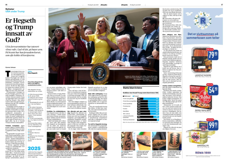 Vv 7: Gudegitt. Er Hegseth og Trump innsatt av Gud? Aftenposten spør (klippet ved siden av). For en hedning som bloggeren er spørsmålet uinteressant. Men Hegseth har i det minste norske aner.