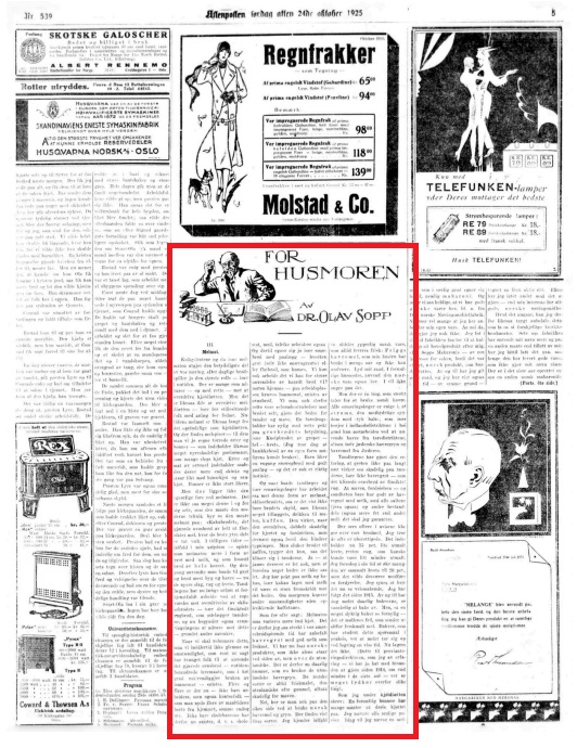 Vv 7: Husmortips. Da Aftenpostens aftenummer eksisterte, hadde denne delen av avisen gjerne forbrukerstoff. For husmoren var en fast spalte skrevet av dr. Olav Sopp. I våre dager, med et økende antall «trad wives», vil kanskje noen av bloggens lesere finne interessant stoff i spalten (klikk nedenfor for å lese).