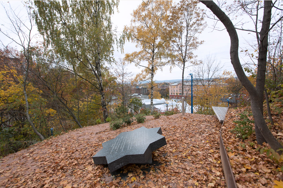 350 meter unna ligger altså Hasleveien, det er et steinsprang gjorde at studentboligene og boligblokken på oversiden av raset måtte evakueres. I sørenden av det platået som har rast i kanten, ligger den lille parken «Dette er et fint sted». Der finner man opplysninger om Syversens gartneri, som ifølge krigshistorikeren Ragnar Ulstein var utgangspunkt for «krigens største redningsbragd». Jeg kjenner at det napper i samfunnsfaglærerfoten; her ser jeg gode muligheter for undervisningsopplegg om Norge under okkupasjonen og om flyktninger (jeg er gjerne konsulent hvis noen er interessert).