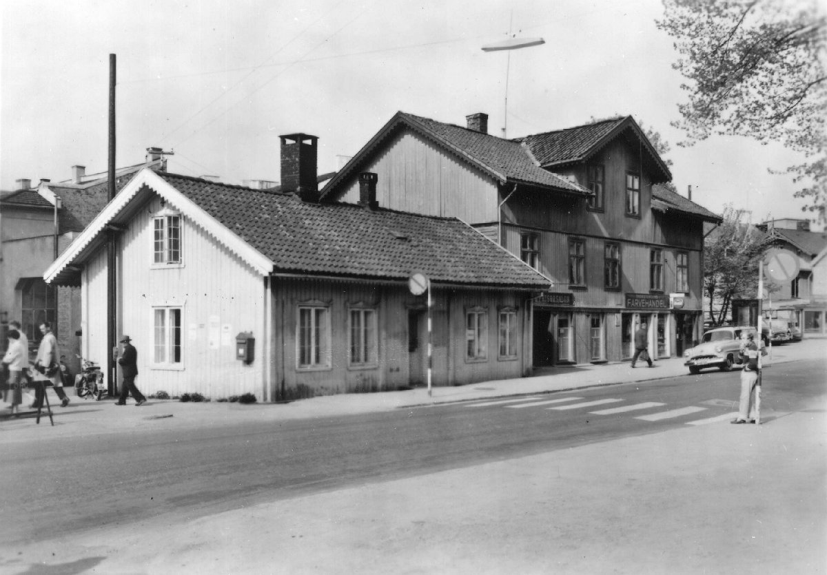 Vv 6: Lokalhistorie-1. Bildet ved siden av viser hvordan Sandvika sentrum så ut da bloggeren vokste opp. Lokalavisen Budstikkas redaksjon holdt til i det lille huset nærmest. Tvers over veien (gaten?) fra det store huset lå «Rønna», tidligere Sandvika middelsskole, som huset noen av realskoleklassene ved Valler kommunale høgre allmennskole. Bygningen ble revet etter at bloggeren hadde vært elev der i ett år.