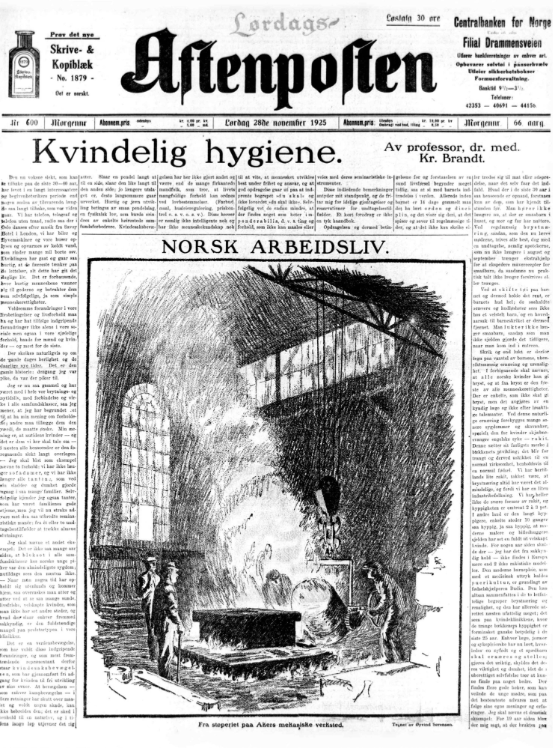Vv 8: Ordrikt. Førstesideoppslaget – og eneste oppslag – i Aftenposten for hundre år siden i dag hadde tittelen Kvindelig hygiene. Der ga professor dr. med. Kr. Brandt bl.a. uttrykk for sitt syn på arbeidsfordelingen i hjemmet. Aftenposten syntes nok artikkelen var viktig, for den fylte også hele side 2 og mesteparten av side 6.