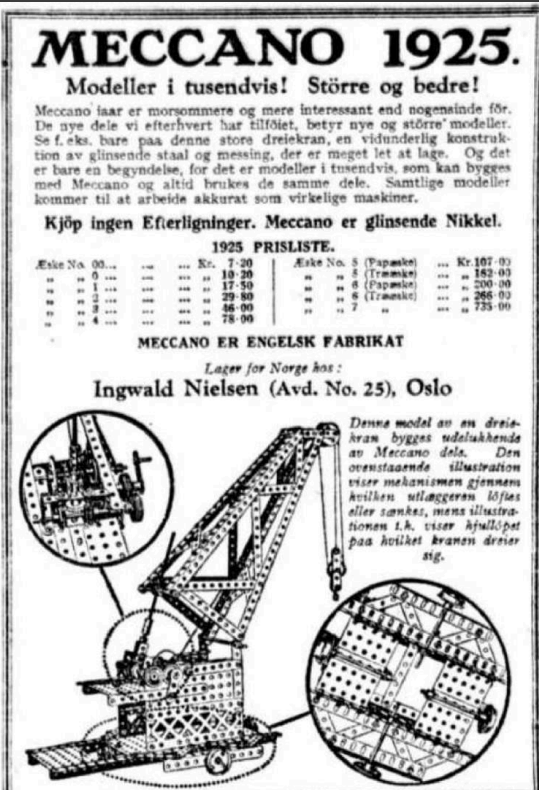 Vv5: Teknisk. Meccano er en julegave bloggeren husker fra sin barndom. Den hadde han glede av i mange år, og den var ikke så ulik 1925-varianten (annonsen ved siden av).