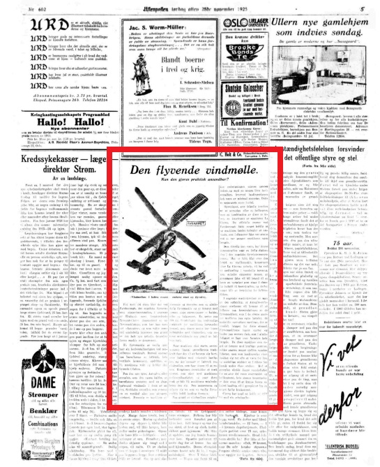 Vv8: Flyve-anordning. «Den flyvende vindmølle» var Aftenpostens betegnelse på det som egentlig ble kalt autogiro. Innretningen ble demonstrert for det engelske flyvevæsen i 1925, og har åpenbart blitt videreutviklet.