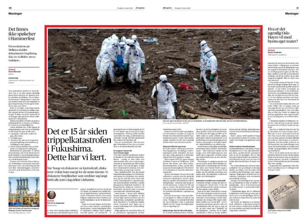 260318: K-kraft. De siste femti årene har det vært tre store ulykker – Three Mile Island, Tsjernobyl og Fukushima – ved de mer enn to hundre kjernekraftverkene i verden. I Aftenposteen bruker Finn Arne Jørgensen Fukushima-katastrofen som utgangspunkt i et debattinnlegg der han argumenterer mot kjernekraft. Det blir som å bruke personsikkerheten i en T-Ford fra 1920 som argument mot bilkjøring i dag. Men dette gjelder riaikovurdering, og da kan man undre seg over hvilken risikovurdering som lå bak den mangeårige flyplassen på Fornebu, med inn- og utflyging over Oslo sentrum. Eller engste seg for hva som finnes av farlig last i de mange bilene som passerer på E18 nedenfor bloggens hovedkvarter. Bloggeren kommer nok ikke til å oppleve ferdigstillelsen av Kadettangen kjernekraftverk, mwn kan berolige nabolaget, som sannsynligvis vil få strøm derfra. (Les også tilbakeblikkene om kjernekraft 14.07.2023, 11.07.2025 og 12.09.2025).