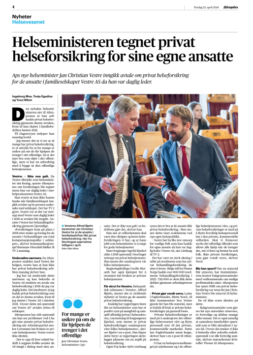 «Aftenposten har stilt spørsmål om han ser problemer ved å ha gitt sine ansatte privat helseforsikring når Arbeiderpartiet ønsker å stramme inn bruken av private helsetjenester. Vestre svarer ikke direkte.» (Les hele artikkelen)